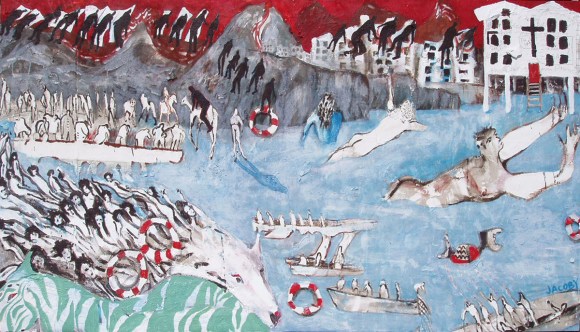 Audience Over Water | 36″ x 60″ Pencil, Charcoal, and Acrylic on Canvas
